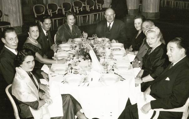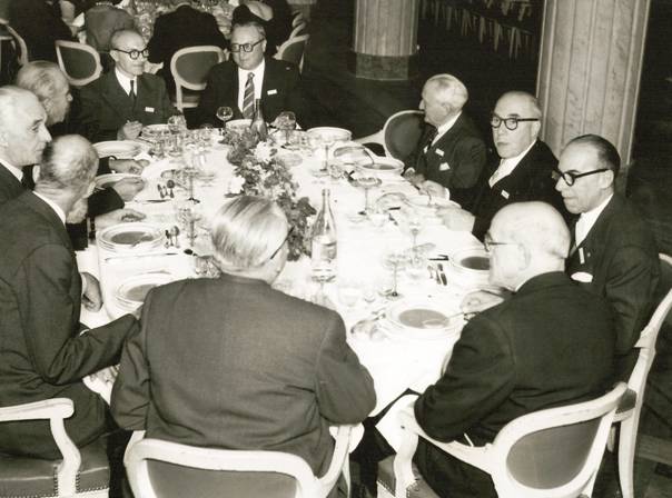 Dîner de création de la Fédération européenne des producteurs d'abrasifs le 21 octobre 1955, présidée par J. Freysselinard (au fond à gauche avec les lunettes ; le monsieur au fond à droite à côté de la chaise vide, sans lunettes et tourné vers Jean, est André Nivoit, frère de Marguerite Lebrun), au siège de l'Automobile club de France, place de la Concorde