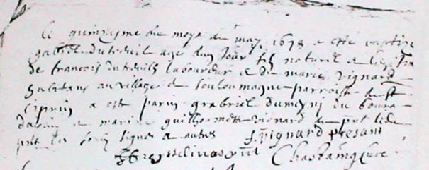 (Cliquer pour agrandir la photo) « Ce quinzième du mois de mai 1678 a été baptisé Gabriel Dutreuil, âgé d’un jour, fils naturel et légitime de François Dutreuil, laboureur, et de Marie Vignard, habitant au village de Souloumagne, paroisse de St Cyprien. A été parrain Gabriel Dumeyni, du bourg d’Ayen, et marraine Guillaumette Vignard, du Pont Libre Pour les soussignés et autres. Vignard, Freysselinard, Chastaing, curé »