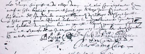« Le vingt-cinquième du mois d’août mille six septante et neuf [1679], a été baptisé Guinot Reynal, âgé de trois jours, fils naturel et légitime de Jacques et Marie Vignard du village de Chantegrelle [commune de Vars]. A été parrain Guinot Reynal, laboureur, et marraine… tous habitant du présent lieu ou paroisse, lesquels [invités] par moi n’ont signé pour ne savoir … par mon… les soussignés et autres. Reynal, Freysselinard,…, Chastaing, curé»
